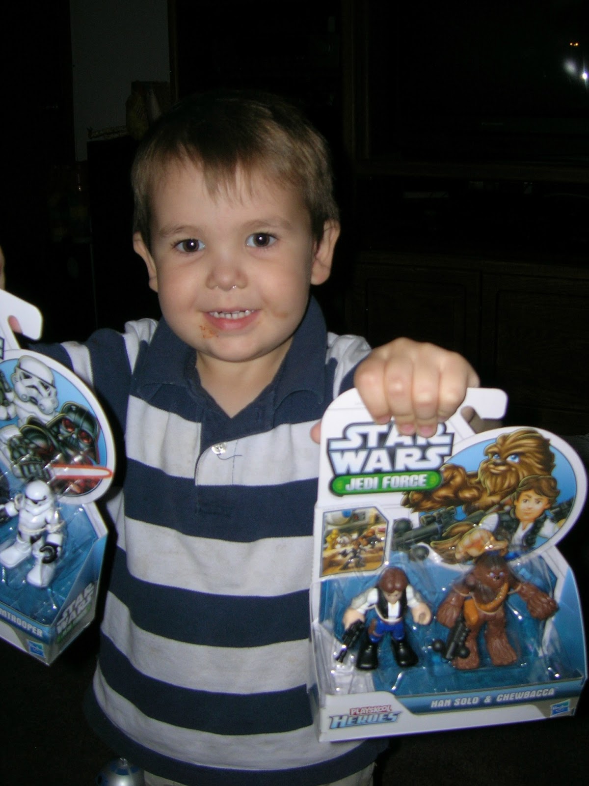 He received lots of Star Wars gifts and he was a very, very happy little boy! Love the pizza sauce smudges on those cheeks.